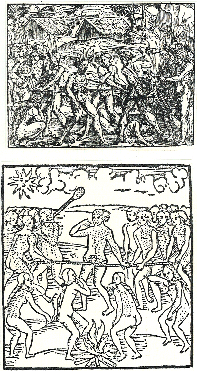 La corde et la massue (dans Staden). La massue (dans Thevet).