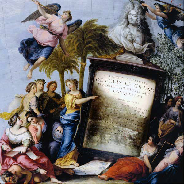 Le texte de la dédicace de César dEstrées à Louis XIV est accompagné de dix allégories représentant la Géographie, la Navigation, lAstronomie, lHistoire, le Temps, lÉloquence et la Poésie, la Géométrie, la Sculpture et la Musique.